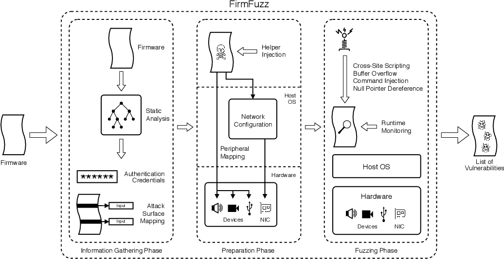 Frankenstein 提供了一个虚拟环境来fuzzing无线设备固件,该工具在固件在运行时转储其当前状态,然后在虚拟环境中重新执行以进fuzzing。