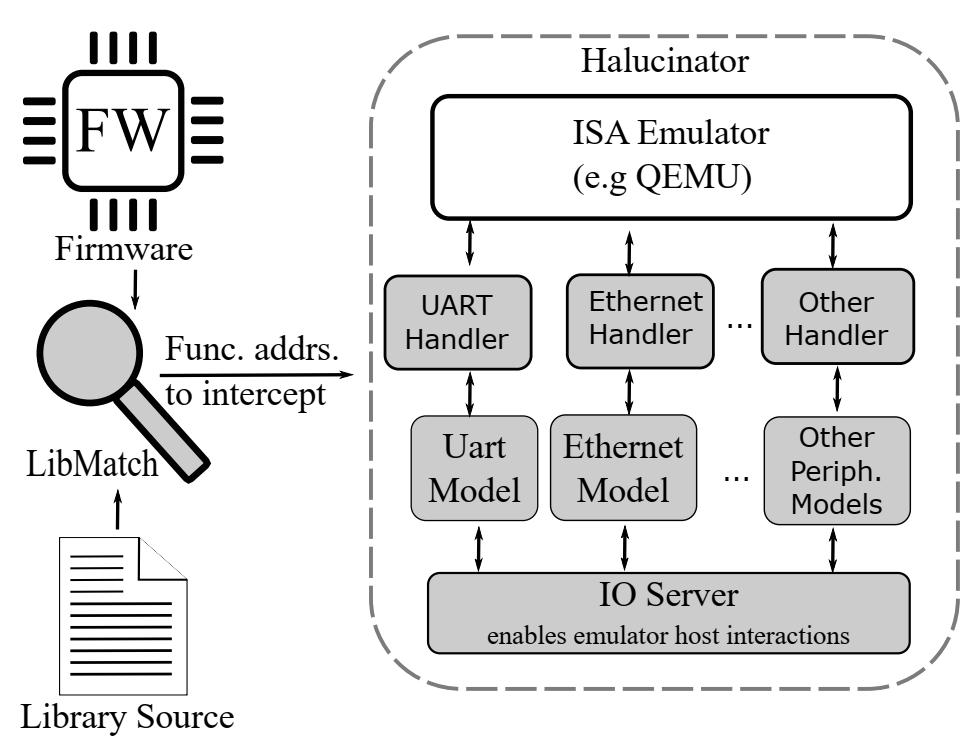 1、High-level emulation:通过hook和从新部署已知库来解决缺少外设的问题,从而避免硬件访问抱错,这样会导致前期手动工作量很大;