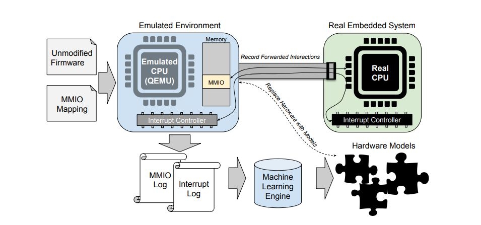 Pretender通过观测固件与设备之间的交互记录,使用机器学习/模式识别为每一个外设创建模型,再使用QEMU或angr结合生成的外设模型实现固件Rehosting。