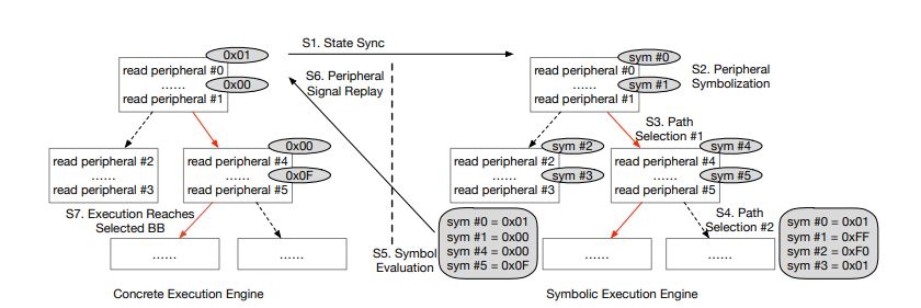 Laelaps针对ARM MCU,通过符号执行辅助外设仿真来推断固件的预期行为,从而生成适当的输入以动态地引导具体模拟执行。