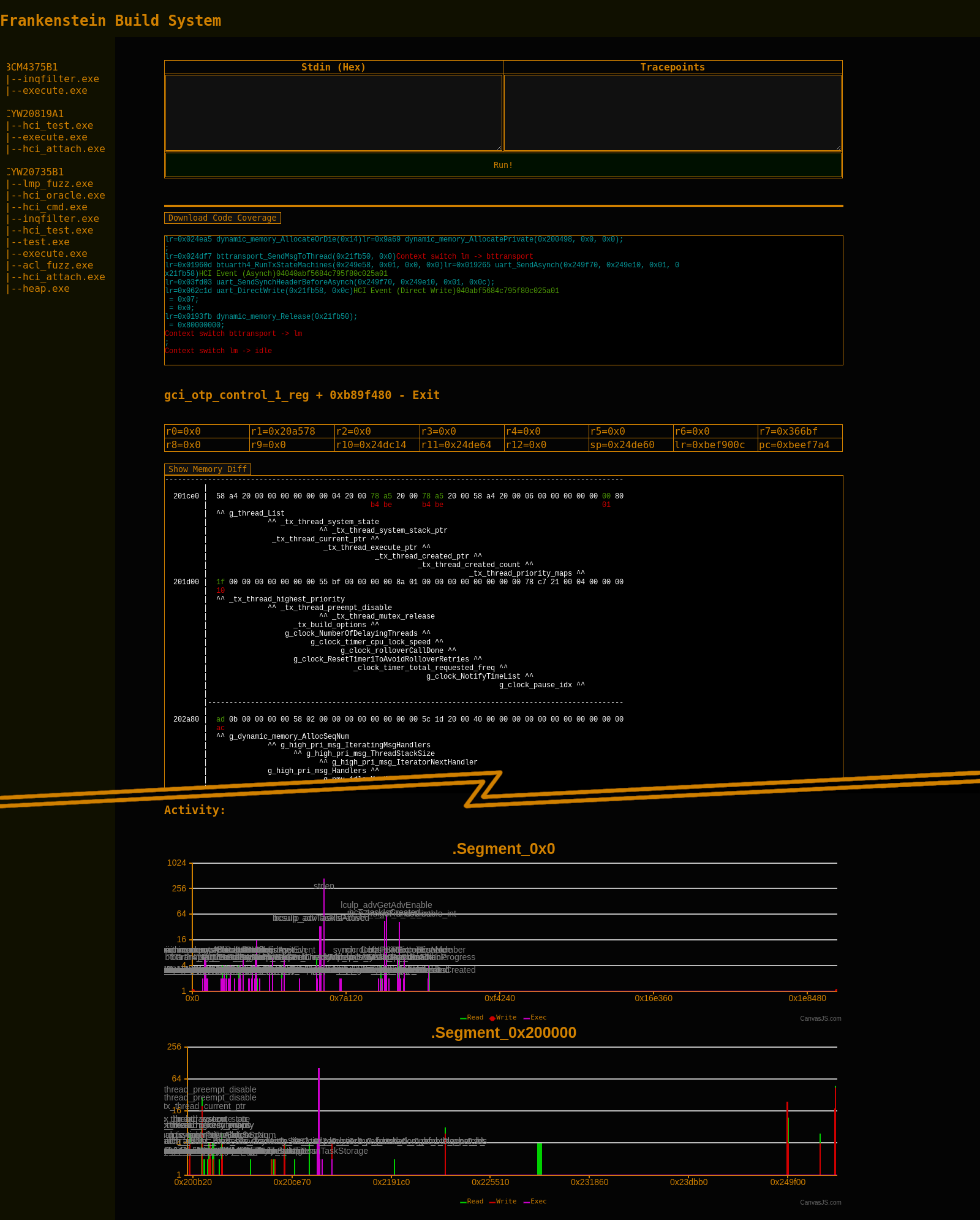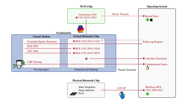 Frankenstein使用QEMU运行仿真,其特点在于通过转储状态使固件“恢复生机”,并为芯片的虚拟调制解调器提供模糊输入。研究人员利用Frankenstein在Broadcom和Cypress蓝牙堆栈中发现三个0Day,该堆栈广泛应用于Apple、三星、Raspberry Pi等设备。